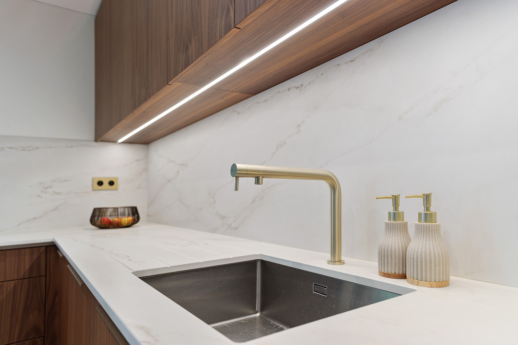Une cuisine chic et contemporaine grâce à la sublime alliance entre le noyer, le dekton Aura et la couleur bleue.